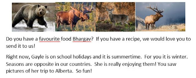 From Flat Mrs Donnelly and Gayle in Alberta, Canada to Bhargav: [Gayle took Flat Stanley along whilst she was waiting for Flat Mrs Donelly to arrive]